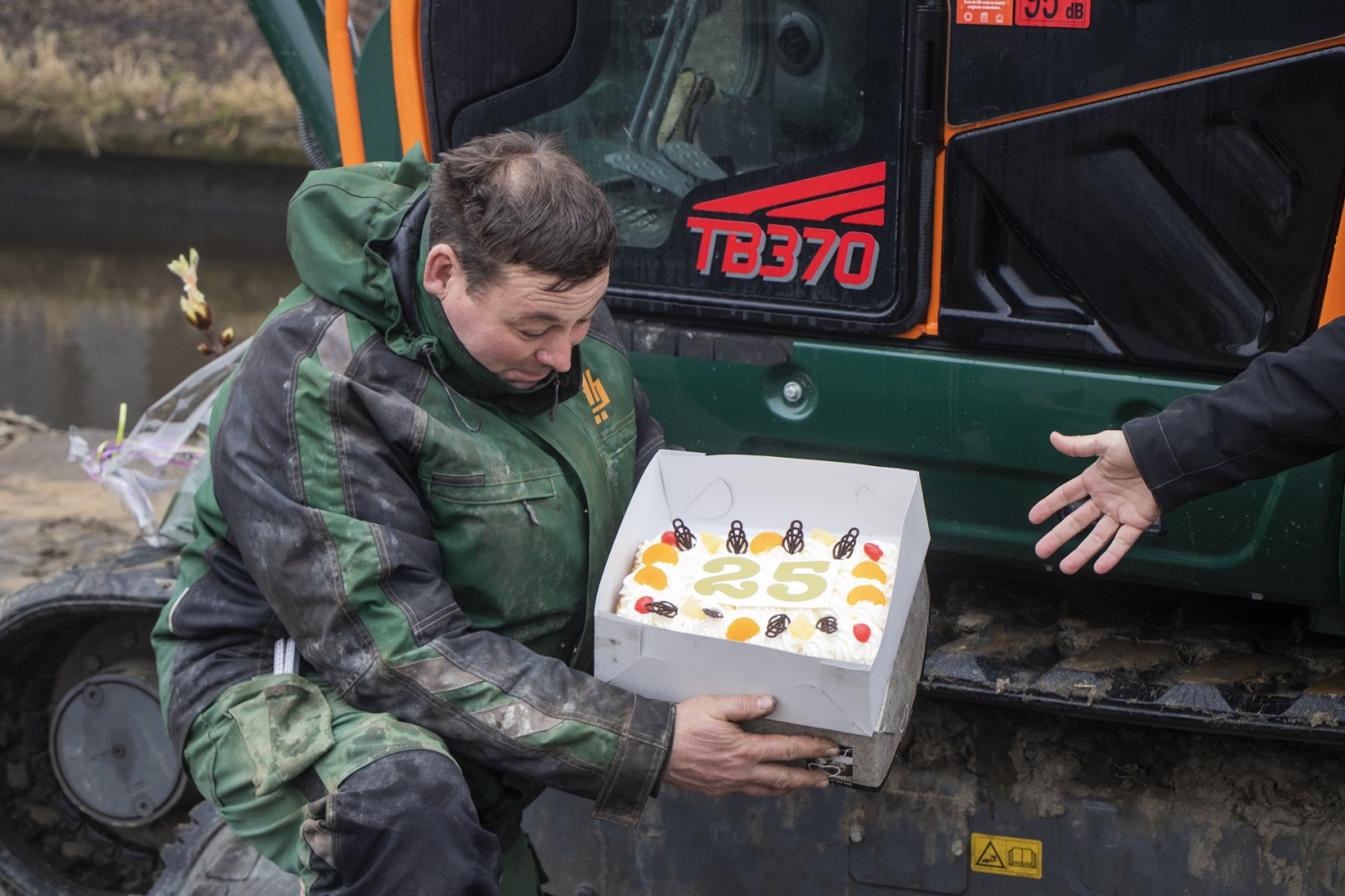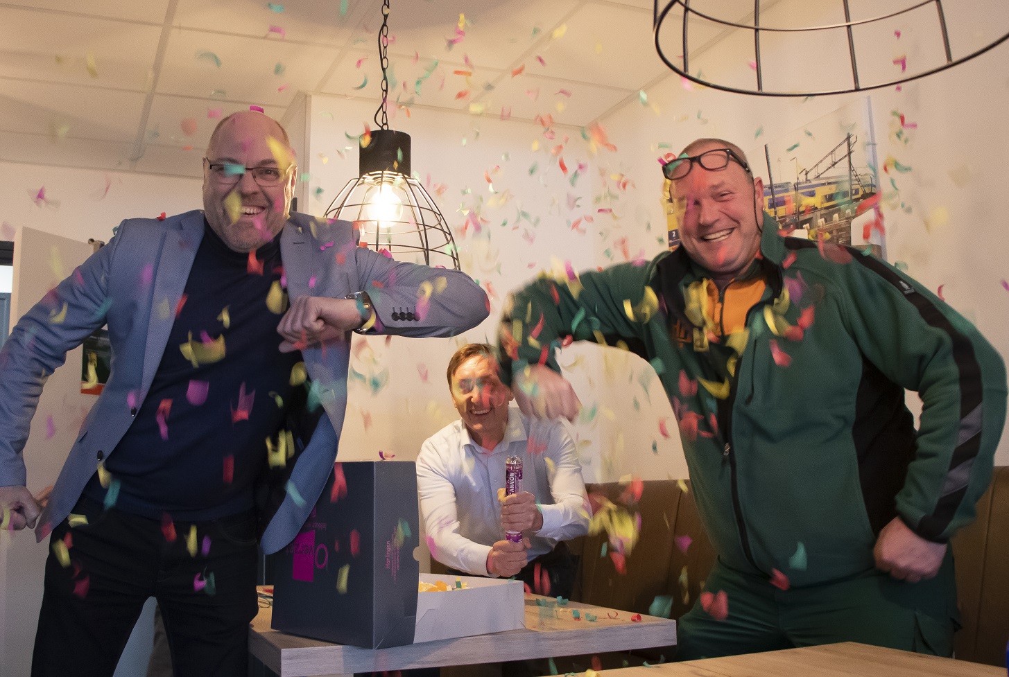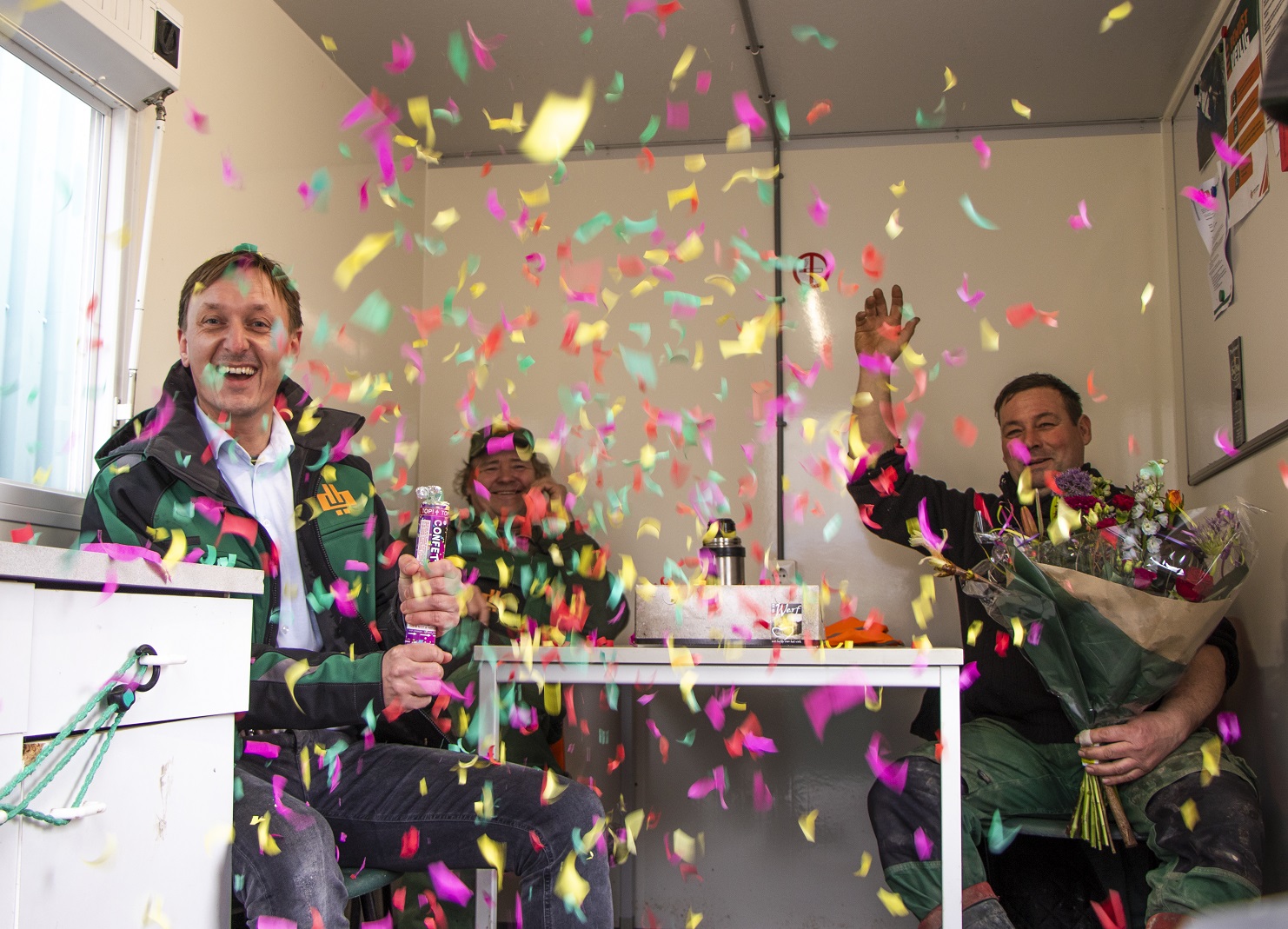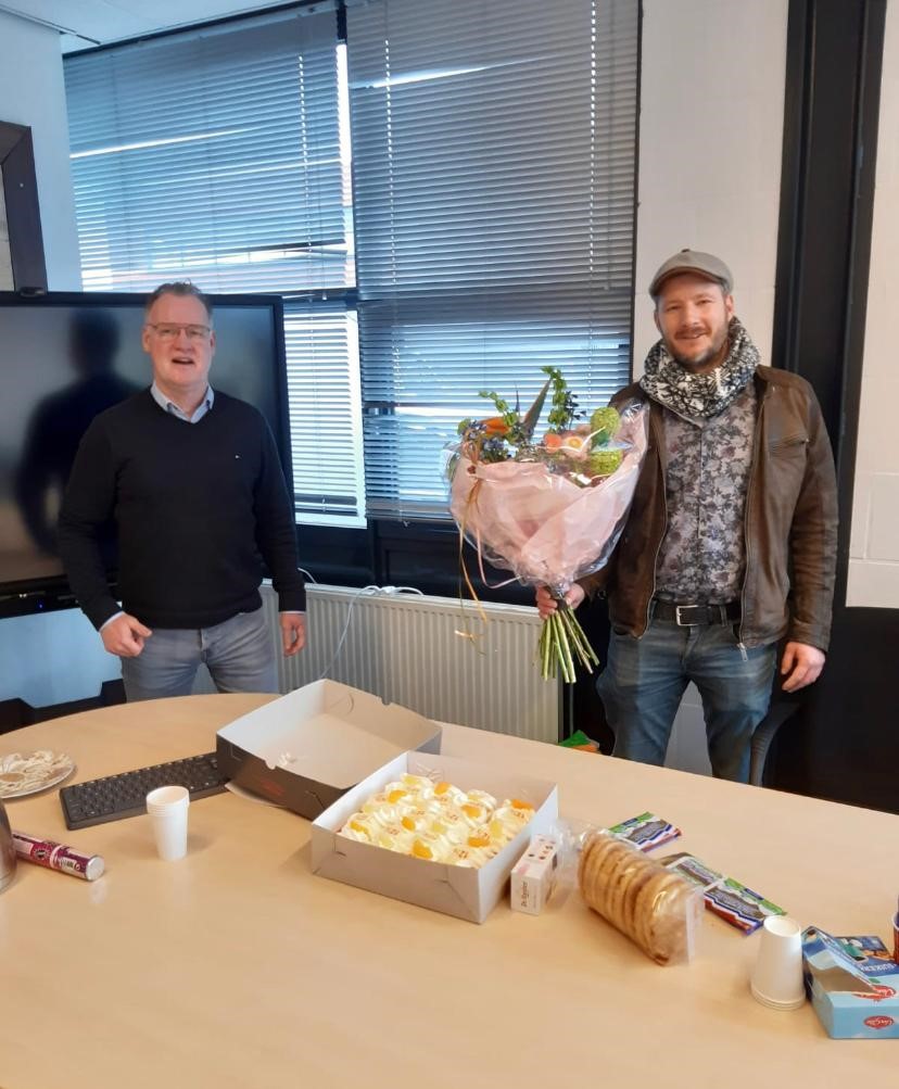 Afgelopen week hebben we in kleine kring het jubileum gevierd van drie collega’s. René van der Klei is al 25 jaar bij ons werkzaam in de uitvoering. Ook Willem Bouman (projectleider) en Huite Dijkstra (materieelbeheerder) zijn met een dienstverband van inmiddels 12,5 jaar vertrouwde gezichten binnen ons bedrijf. Normaal vieren we deze momenten samen met alle collega’s tijdens onze kerst- en bouwvakborrel, maar wegens de huidige omstandigheden hebben we hen dit keer verrast met bloemen en gebak op hun werkplek.