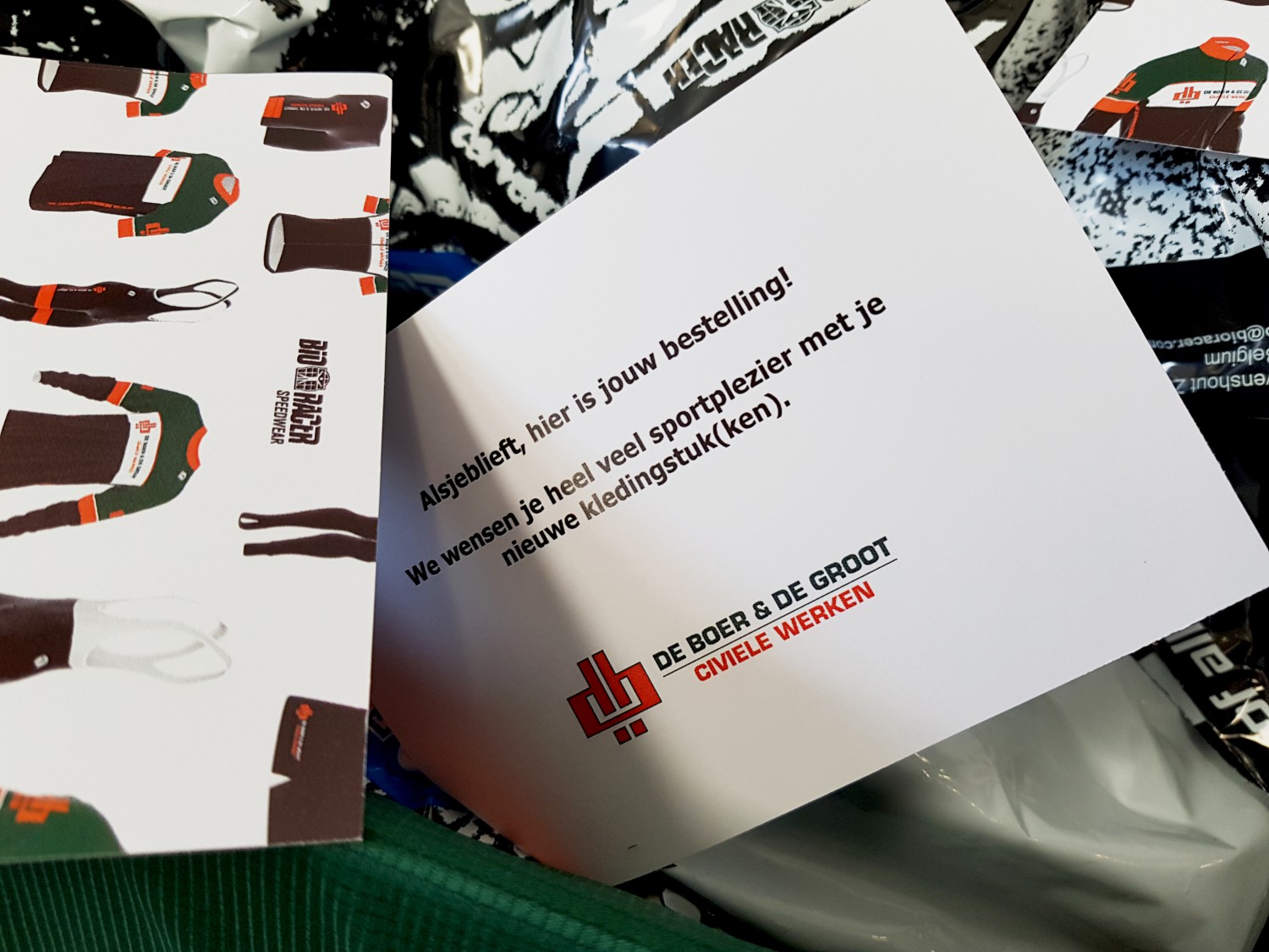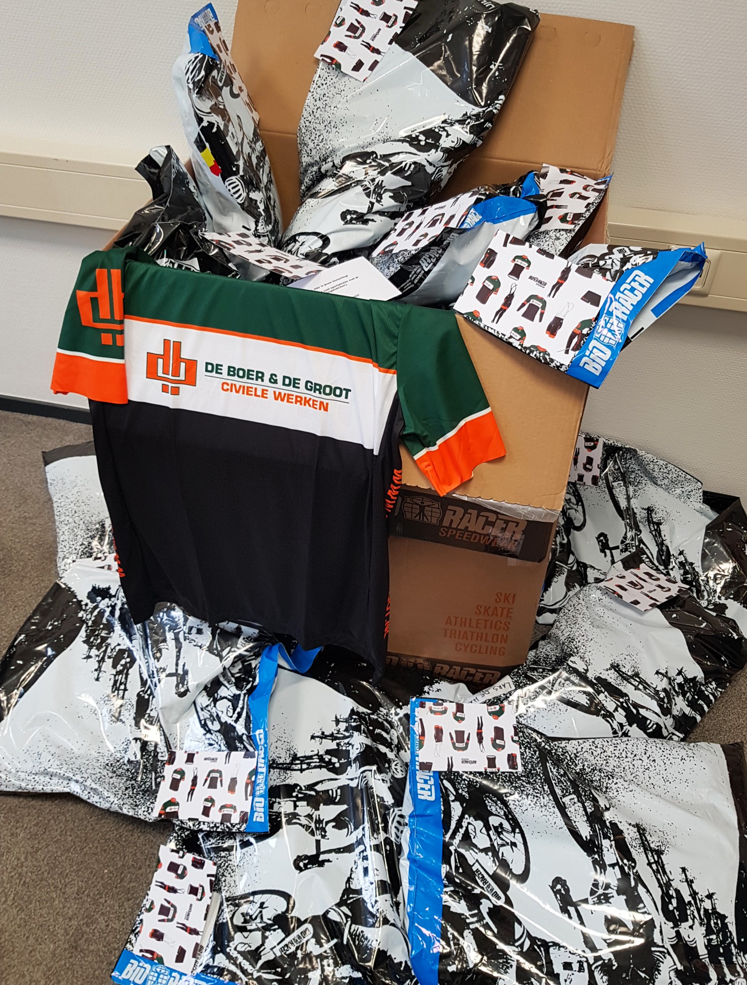 Mede in het kader van onze interne Bewust Veilig & Vitaal campagne is onze eigen De Boer & De Groot sportkleding lijn dit jaar een feit geworden. We stimuleren graag het sporten en (actief) bewegen bij onze medewerkers. Eerder werden de fanatieke wielrenners binnen ons bedrijf al voorzien van wielrenkleding in de bedrijfskleuren, maar onlangs kon ook kleding voor o.a. het hardlopen, schaatsen, skeeleren en voetbal worden aangeschaft. Alle collega’s ontvingen deze week hun bestelling en wensen we heel veel sportplezier met hun nieuwe kledingstuk(ken)!