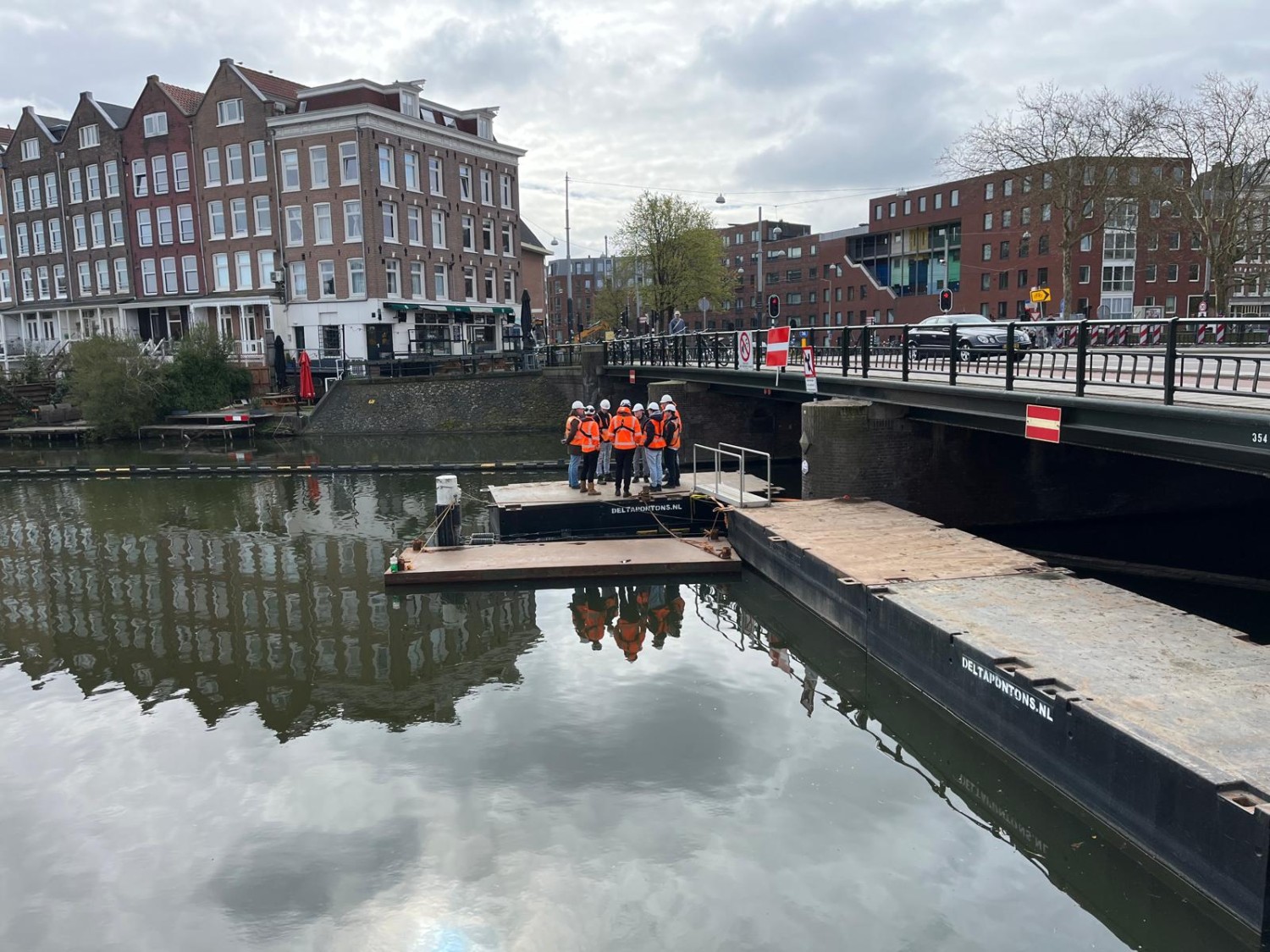 Het bezoek bestond uit een presentatie in de directiekeet, gevolgd door een kijkje op de werklocatie bij de brug. Aansluitend brachten we een bezoek aan kraanschip Durk en bemanning, waar een van de nieuwe sluisdeuren gereed lag voor transport naar de kering. Collega’s Bas Eckmann, Jorrit Schaafsma en Marcel Tukker gaven hier zowel tekst en uitleg over de sluisdeuren als over de speciale hijsconstructie.