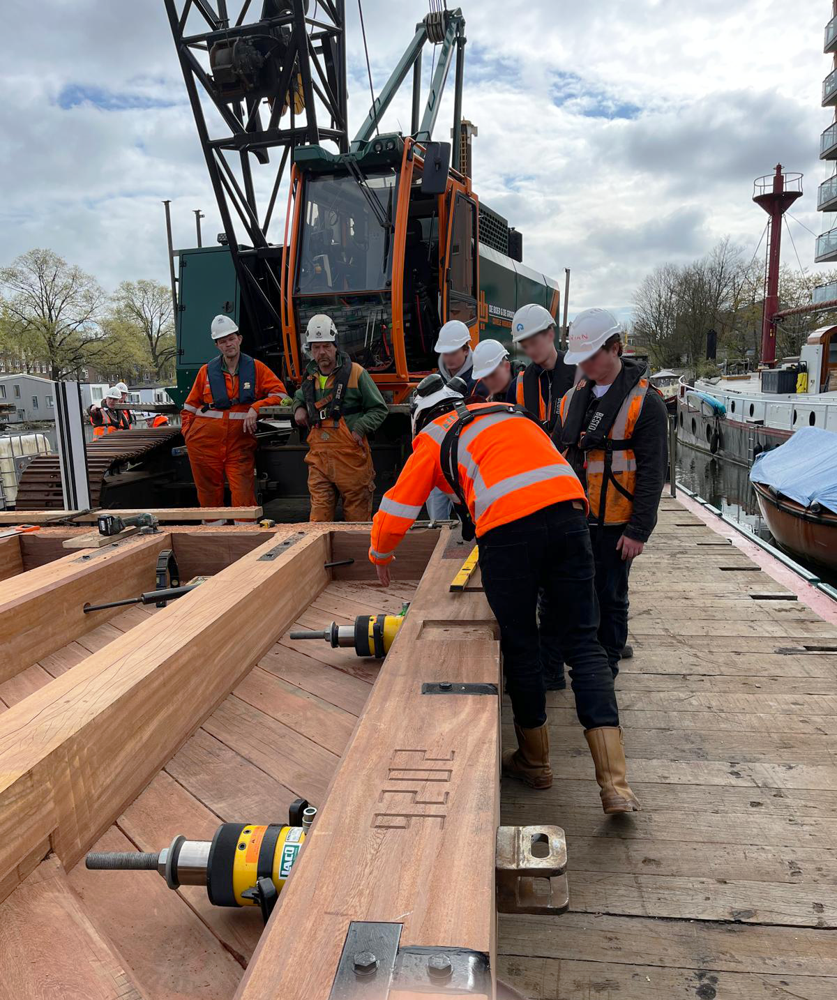 Momenteel zorgen wij hier voor de terugplaatsing van vier nieuwe houten sluisdeuren ter vervanging van de oude. Vanwege de beperkte werkruimte onder de brug maken we gebruik van een door onszelf ontwikkelde en CE-gekeurde hijsjuk. Deze technische uitdaging maakt het project voor de studenten extra interessant om van dichtbij te bekijken.