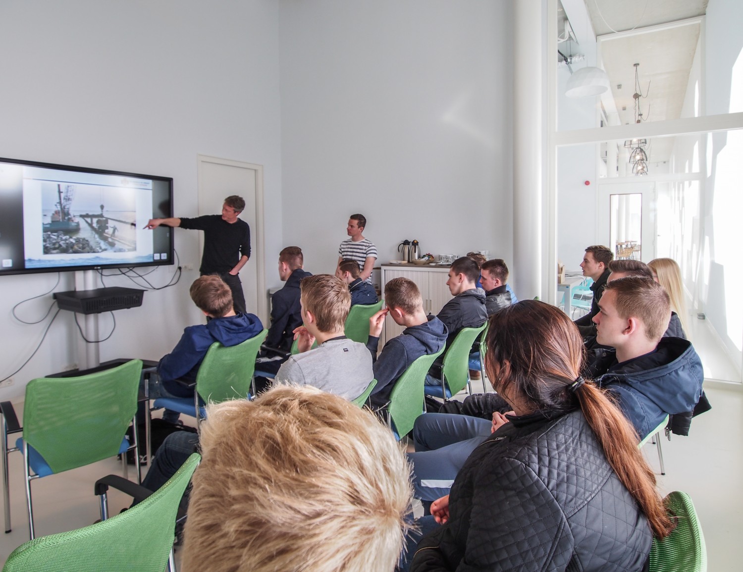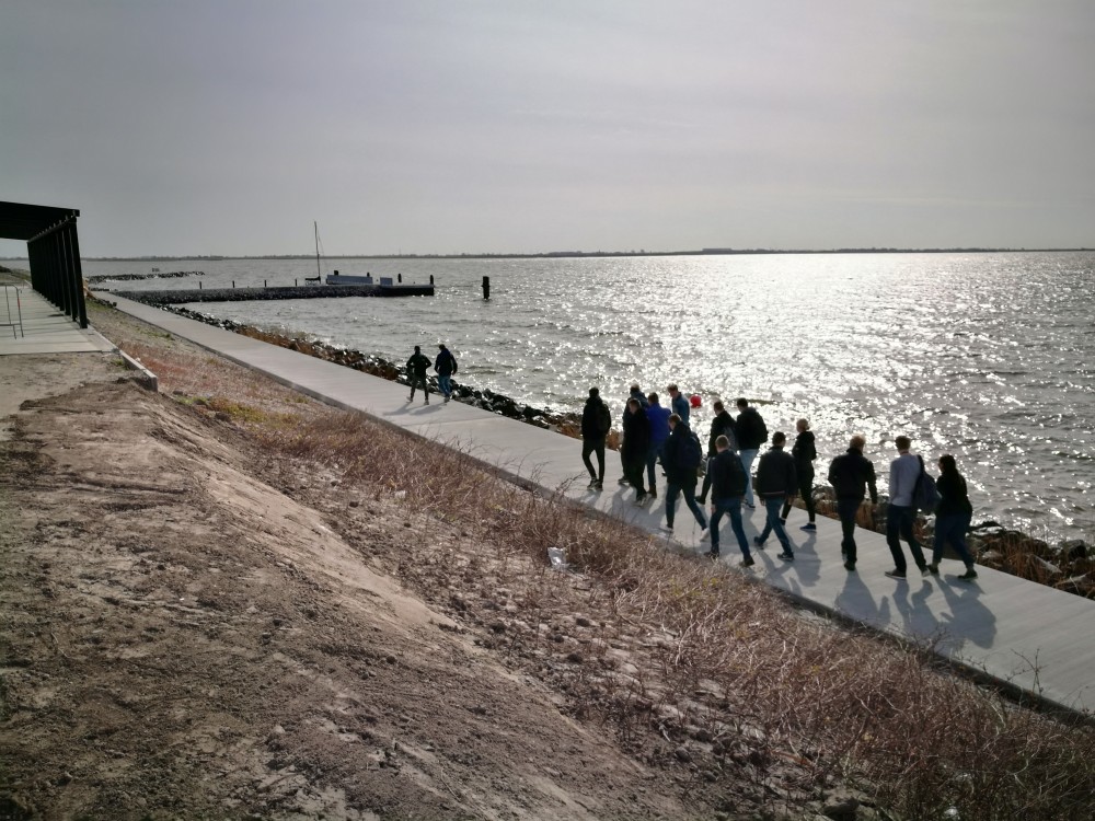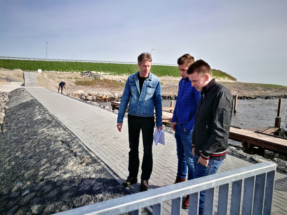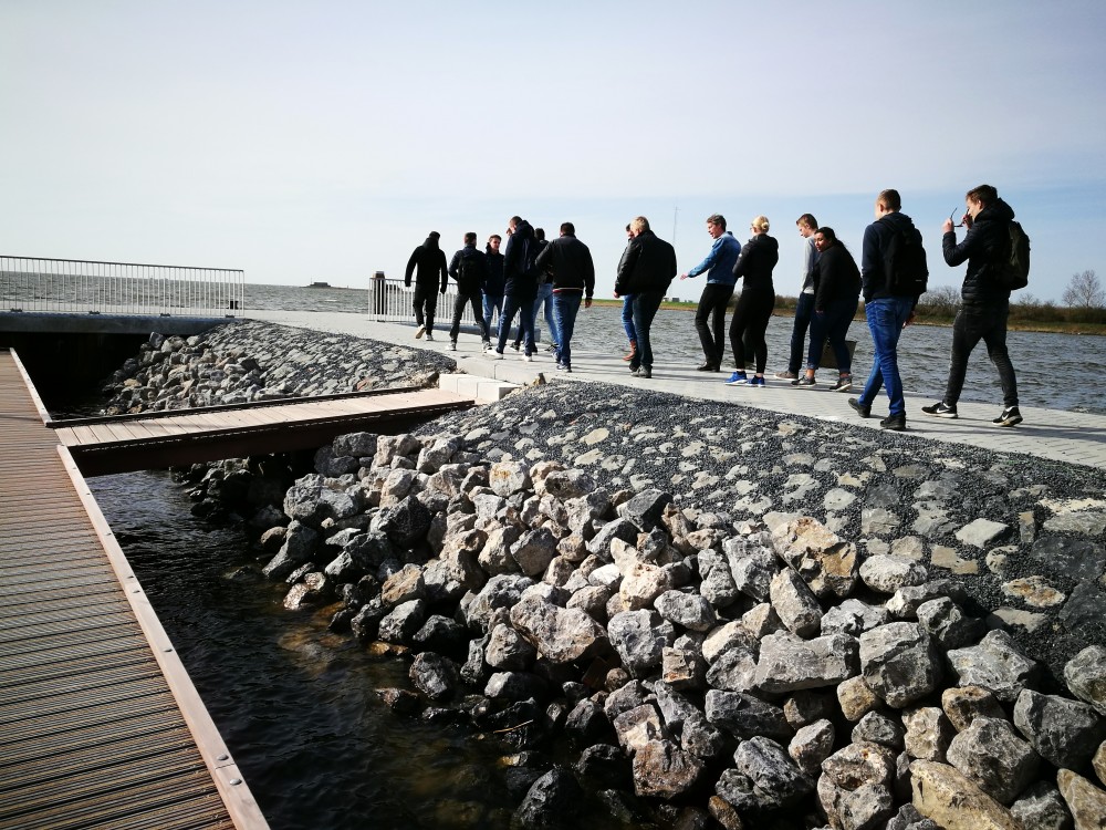 Dinsdag 17 april j.l. hebben 14 eerstejaars MBO-studenten Infra van de ROC Friese Poort uit Drachten het nieuwe Waddencentrum in Kornwerderzand bezocht. Als onderdeel van het bezoek is De Boer & De Groot civiele werken gevraagd om een presentatie te geven over het werk wat door ons bedrijf buiten het bezoekerscentrum in Kornwerderzand is uitgevoerd. Co Bakker (projectleider) heeft samen met Dennis Kemper (werkvoorbereider) de studenten enthousiast gemaakt voor de waterbouw en kennis laten maken met het bedrijf De Boer & De Groot. De gegeven presentatie werd door de studenten goed ontvangen. Na de presentatie is gezamenlijk over het nieuwe betonpad naar de nieuwe pier gelopen om zo het werk van dichtbij te kunnen bekijken.