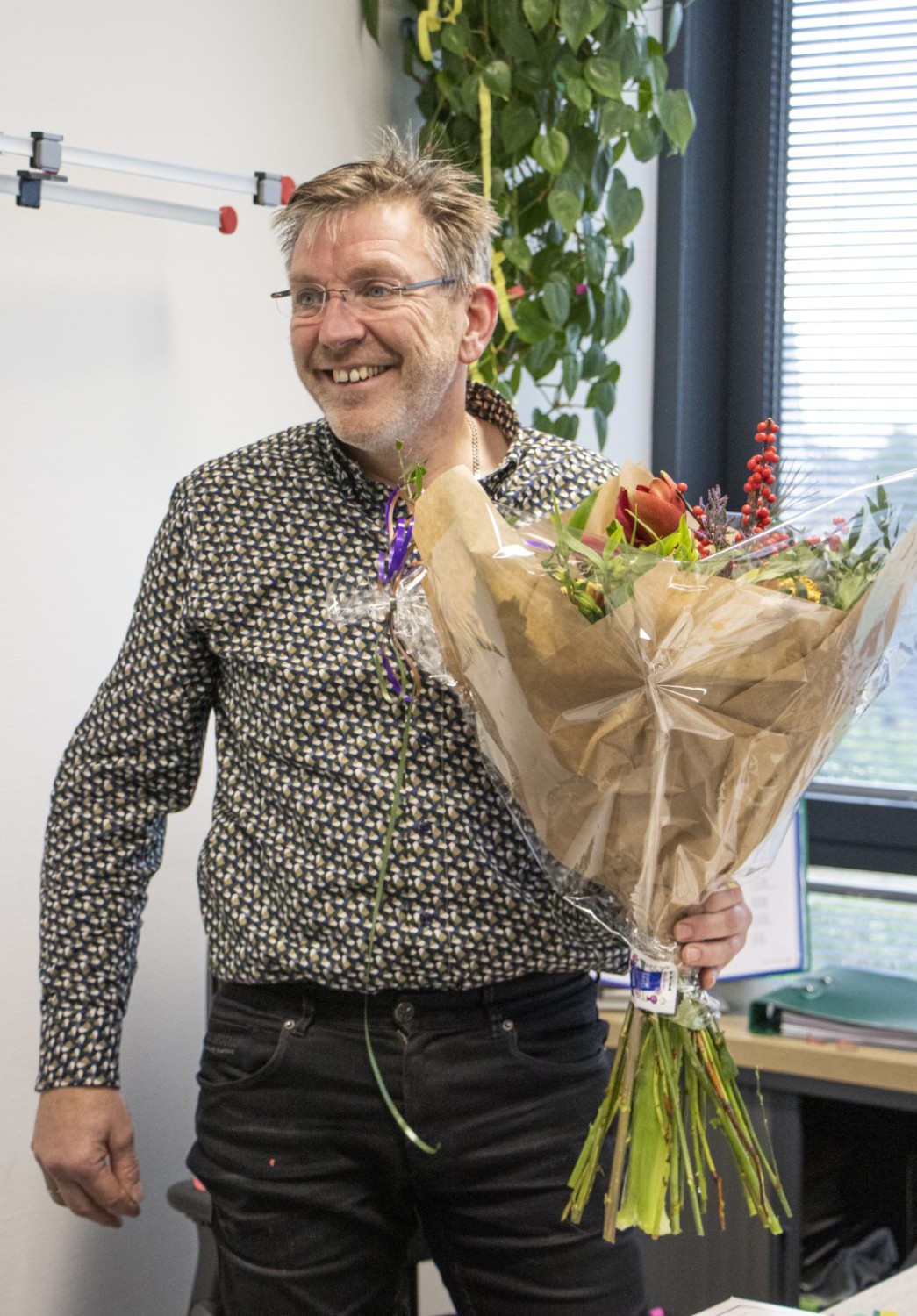 Vandaag hebben we in kleine kring het jubileum gevierd van onze collega Tjibbe Boonstra. Tjibbe is inmiddels al 12,5 jaar bij ons werkzaam op kantoor in Harlingen. Gestart als werkvoorbereider staalbouw, en inmiddels al diverse jaren een vast gezicht op de calculatieafdeling in de functie van calculator. Vanochtend werd hij door Gerard en Herke verrast met bloemen en gebak.