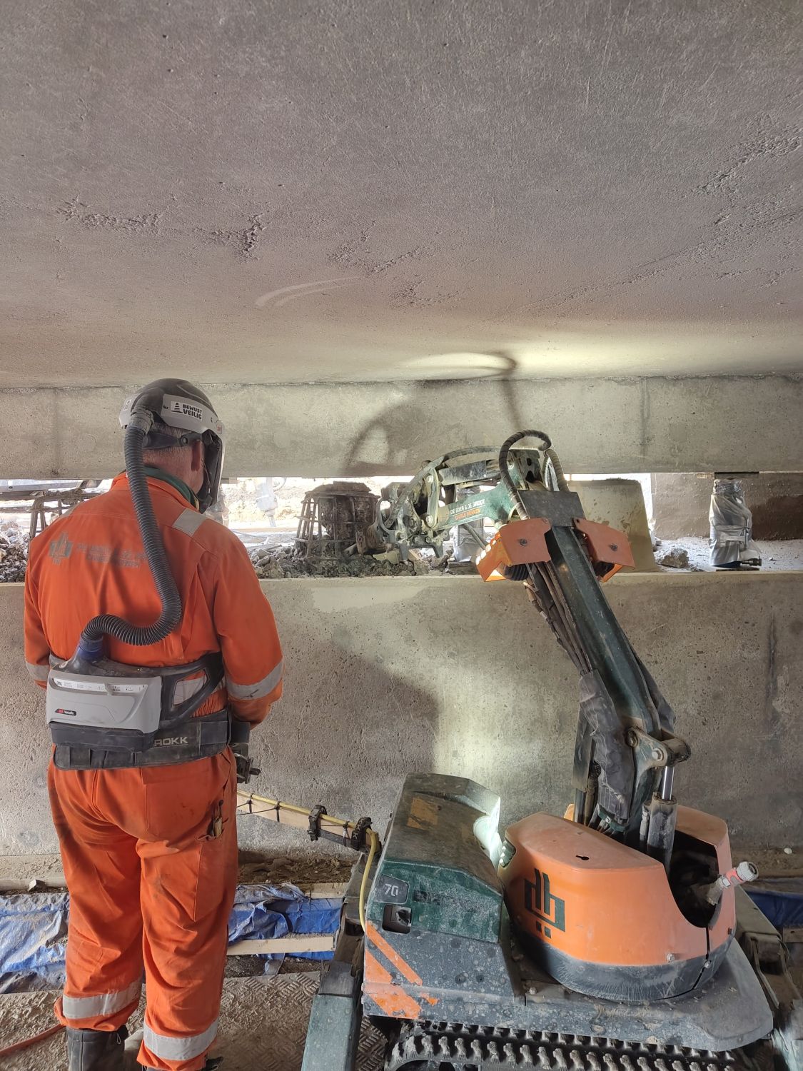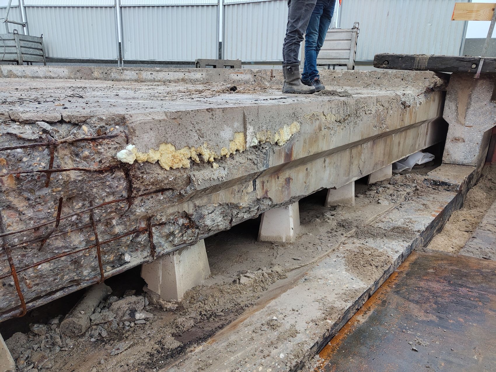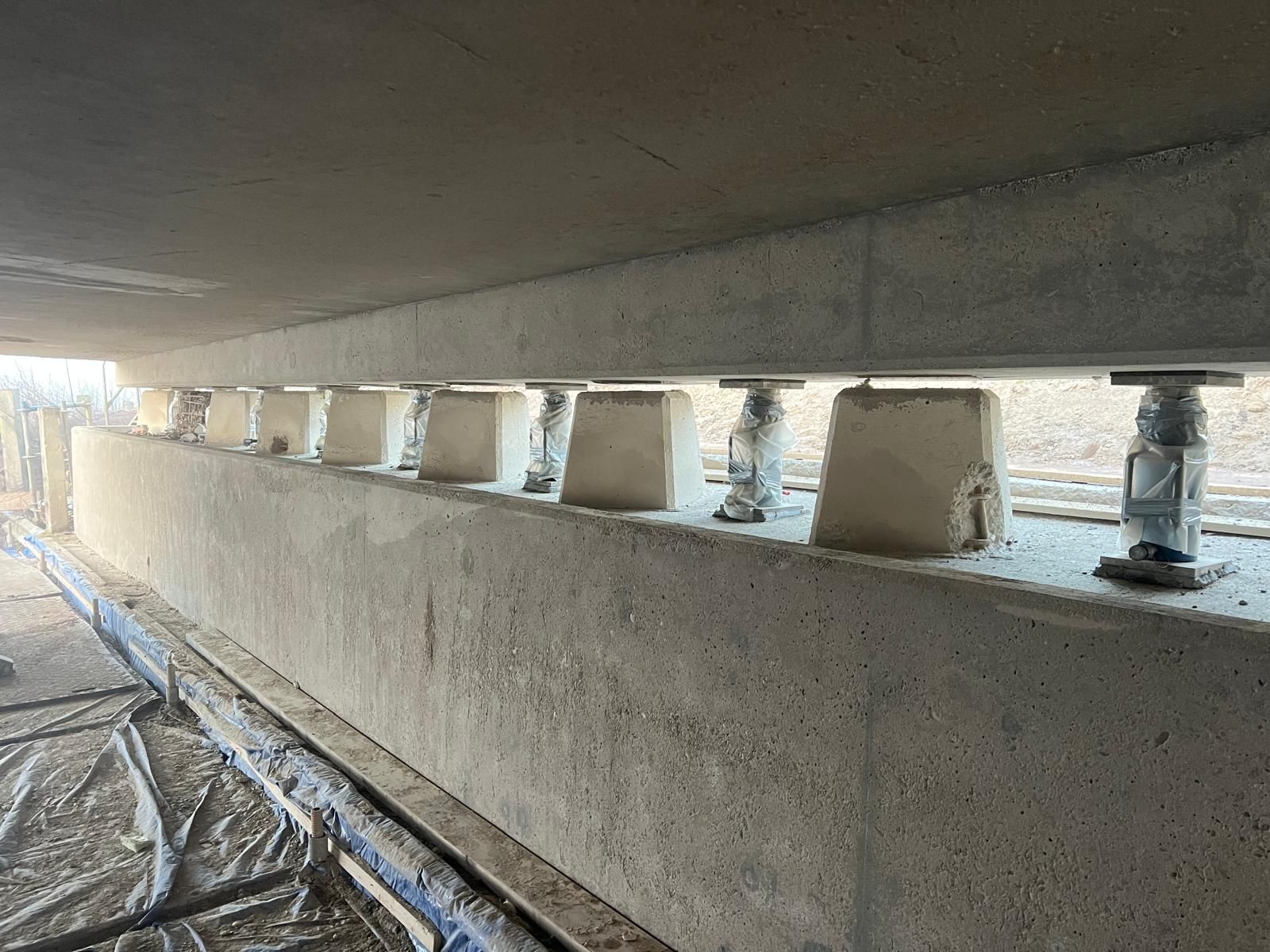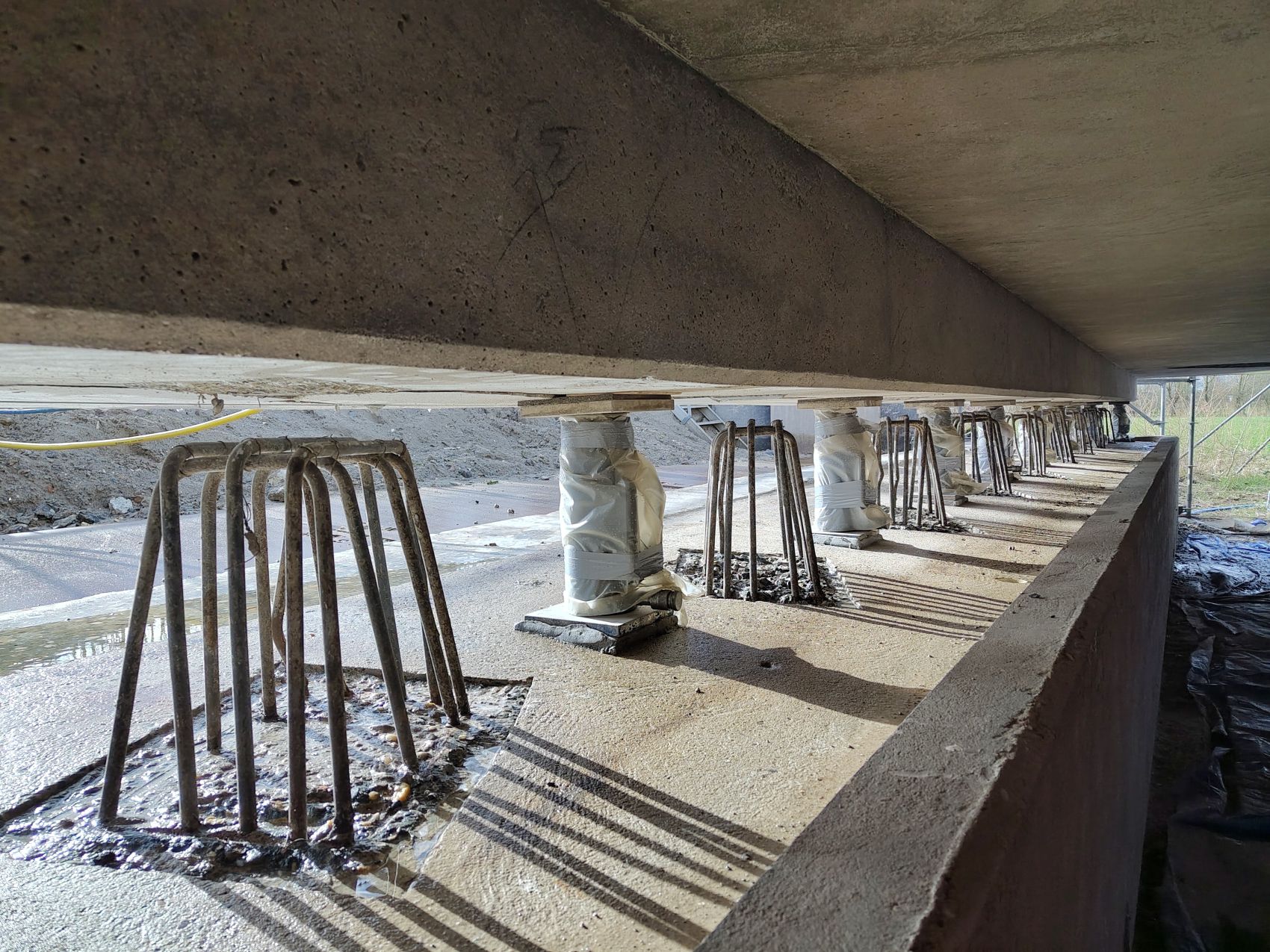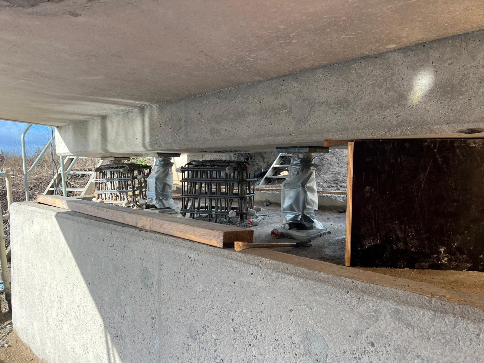 Aan de onderzijde van de brug vervangen we de oplegpoeren. Hierbij wordt de bestaande wapening behouden. Om dit herstel goed uit te kunnen voeren is de brug enkele millimeters omhoog gevijzeld. Na het herstel van de poeren worden nieuwe oplegblokken geplaatst.