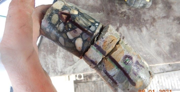 Op het brugdek hebben we het asfalt en schampkant verwijderd. De brug heeft last van ASR-reactie, waarbij bestanddelen van cement samen met reactief grind (vuursteen) een gel vormen die sterk zwelt wanneer deze in contact komt met water. Kenmerkend voor deze schade is dat de scheuren in plaats van door de cementsteen, dwars door de grind biggels heenlopen. Het beton wordt op deze manier van binnenuit kapot gedrukt.